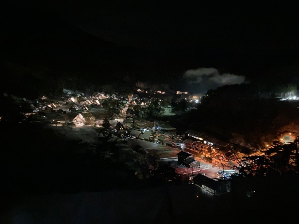 可以肯定的是,在兩天一夜的自由行中,我逛了兩圈合掌村、閱覽了它的歷史;上了三次展望台、俯瞰不同樣貌的村落;在短時間內歷經豔陽高照、雪片紛飛的場景,彷彿置身兩個完全不同的世界;參與了點燈,以及熄燈後黑夜的滿天星斗、遊客散去的寂靜。