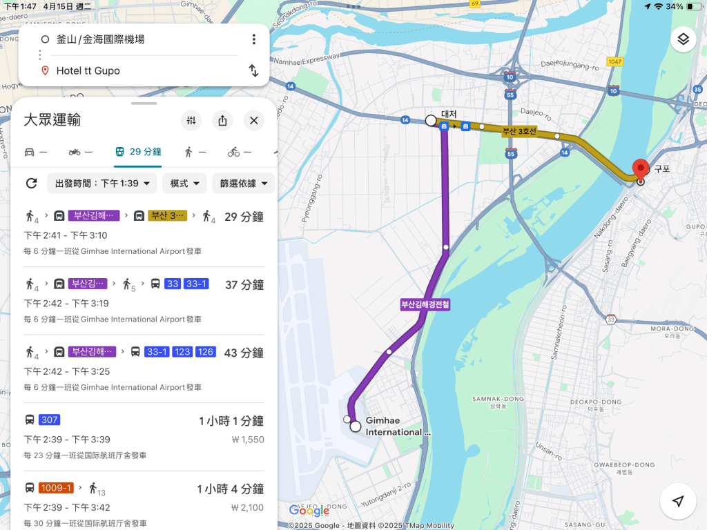 從機場出發,搭乘金海輕軌(紫色線)到大渚 대저(金色線)轉乘,就能抵達龜浦站啦!