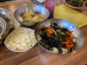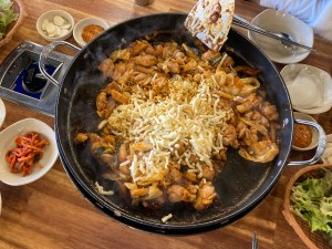 我們三人點了兩份春川炒雞、一份拉麵、一份炒飯、一份起司。雞肉上菜後要自己拌炒,店員經過的話會來關心火侯,有時候也會幫忙翻炒一下,如果不確定是不是熟了、能不能吃,可以再跟店員確認。