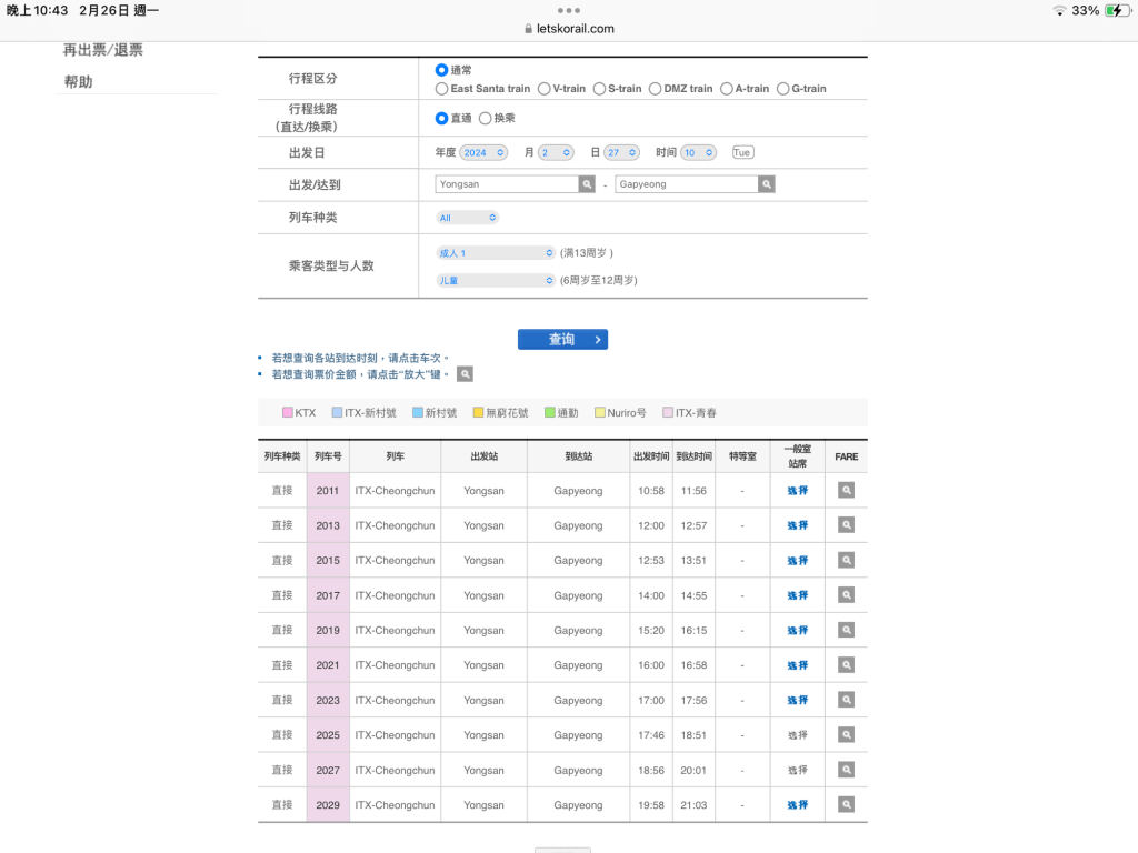 - 出發 / 達到選擇「Yongsan」/「Gapyeong」