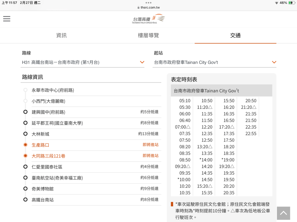 高鐵提供貼心的接駁服務,讓你可以直接搭乘進到台南市區或其他景點,各個停靠站和時刻表請見下圖。