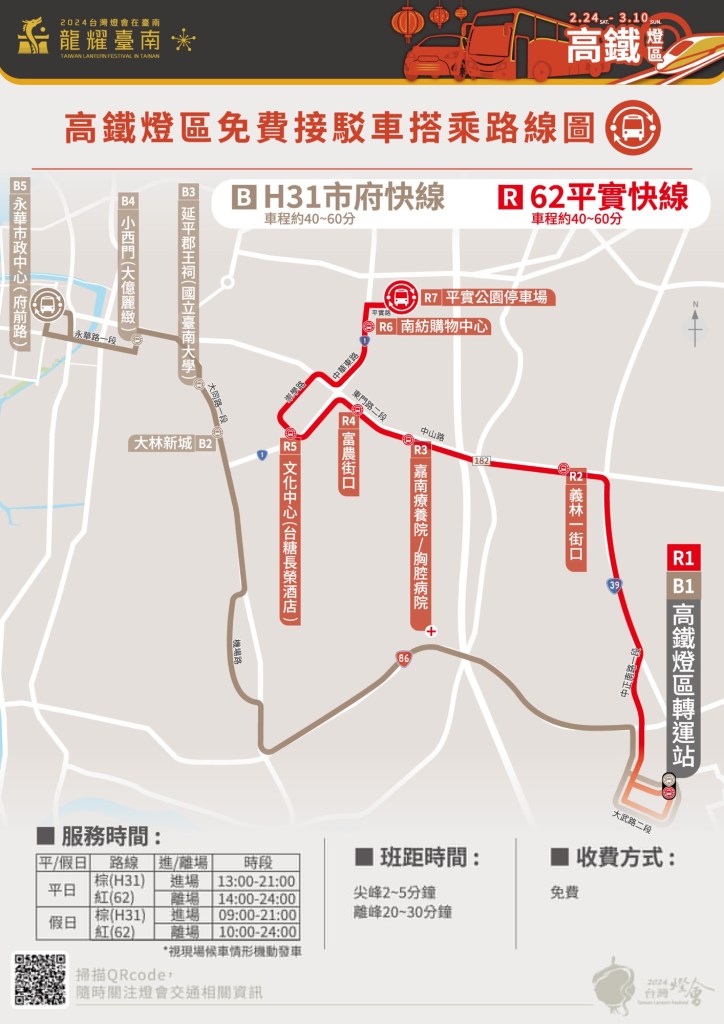 如果逛完市區要回去高鐵站看燈會,台南市也有提供免費的接駁車,詳細時間、停靠站請見下圖。