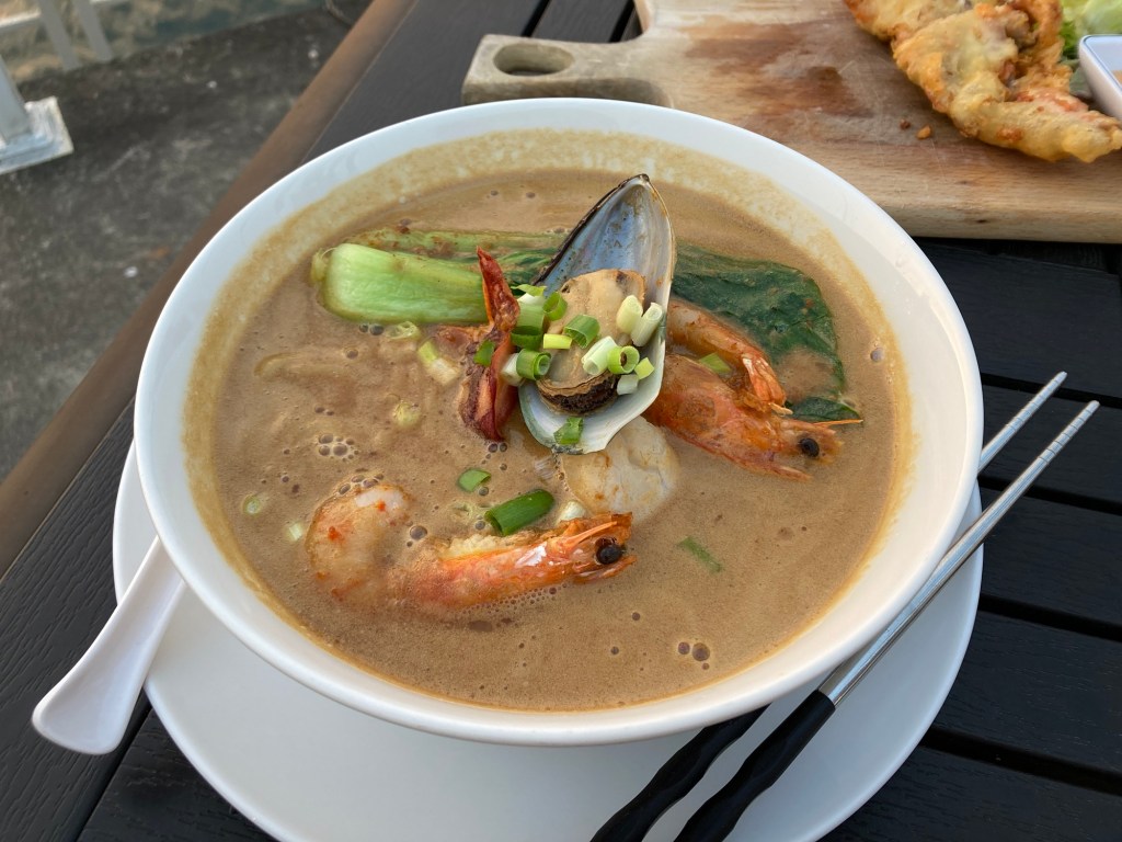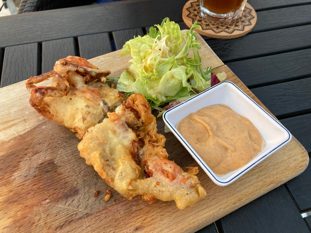 晚餐我們選在高雄展覽館捷運站附近的貝隆餐廳享用,點了沙茶麵、蟹殼沙拉,和一杯調酒分著吃,餐廳景色不錯、有點氛圍,餐點份量蠻大的、但是食物和調酒表現一般般,喜不喜歡見仁見智。吃飽飯足,慢慢地散步到輕軌站,最後搭上高鐵回到台南。