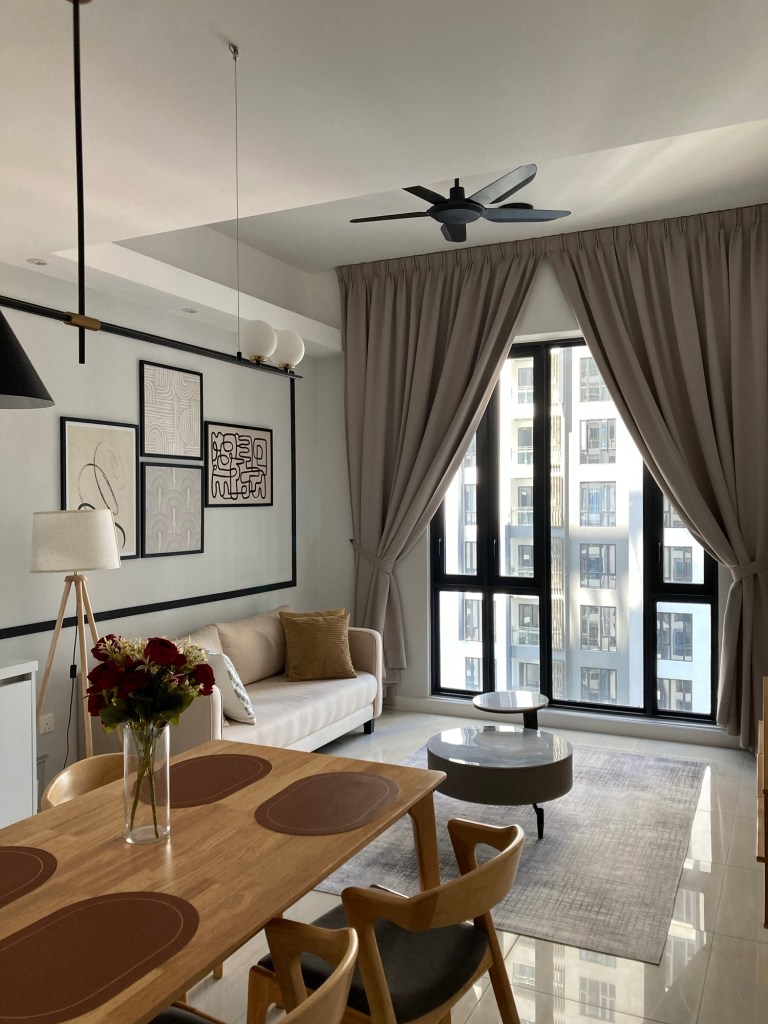 吉隆坡車站走路 10 分鐘抵達 BlueBanana 所在地的住宅區,整棟建築散發著我剛蓋好不久的氛圍,一切都相當的新,屋主領著我們進入 10+ 樓高的住宿地,寬敞整潔、全新裝潢的廚房和客廳映入眼簾,另外還有一間主臥、一間客房、兩間衛浴,空間真的超級大~