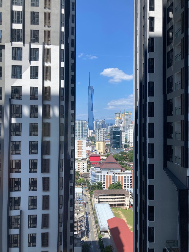 10+ 樓高的房間望出去就可以將城市的景觀盡收眼底,往下可看見游泳池、火車駛過,往前平視就可以看見快要建成的 Merdeka 118(沒錯,就是照片裡尖尖的那一隻藍色建築,馬來西亞人口中的大哥大)。