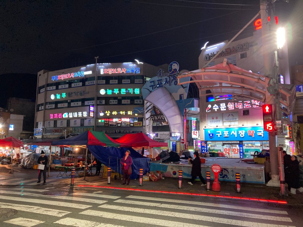 從首爾到釜山一日遊,坐 ktx 抵達時已傍晚時分,我選擇下榻在龜浦的膠囊旅館,鄰近龜浦市場,公車一站即可抵達的距離。趁著晚上用餐時間,跳上公車、迫不急待地到市場尋寶。