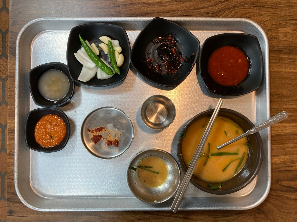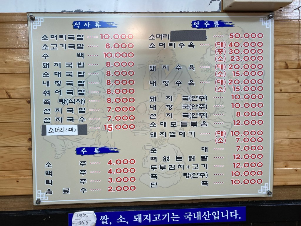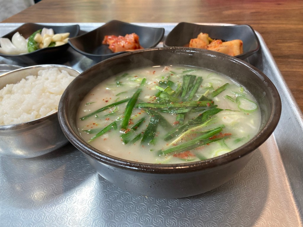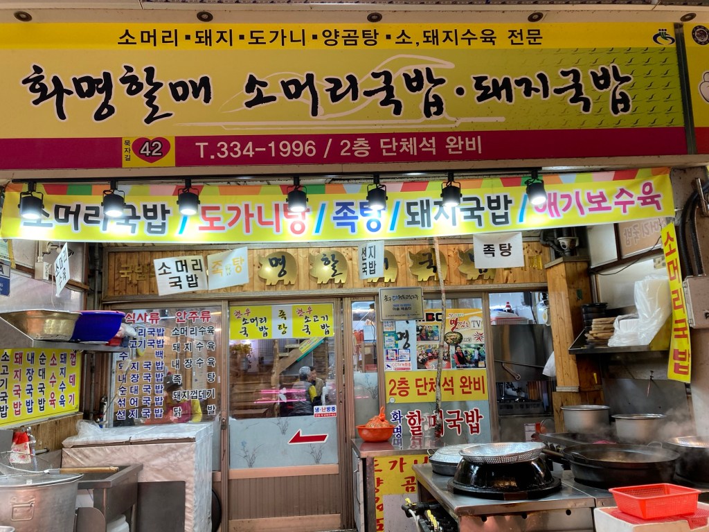 釜山四大美食之一,豬肉飯湯。龜浦市場往裡頭走,黃亮的招牌、明亮的用餐環境,加上門口因為炊煮,冒著煙霧,就把我給吸引進去了。