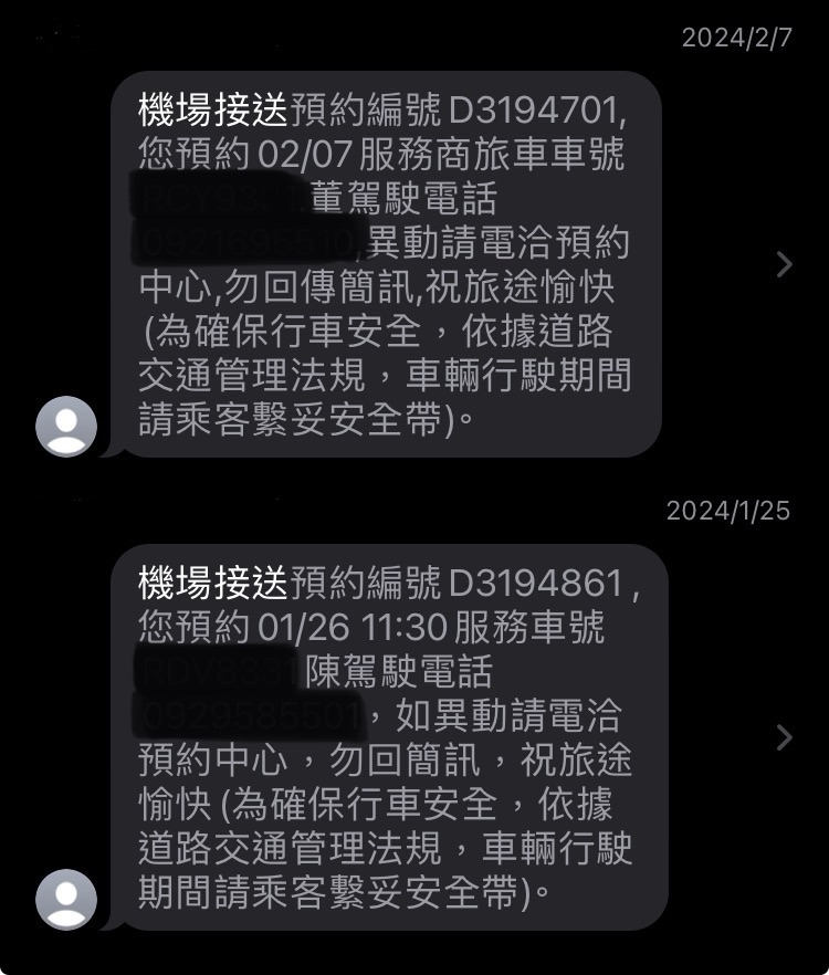 如果預約沒有問題的話,就會在出發前收到來自司機的簡訊,包含: