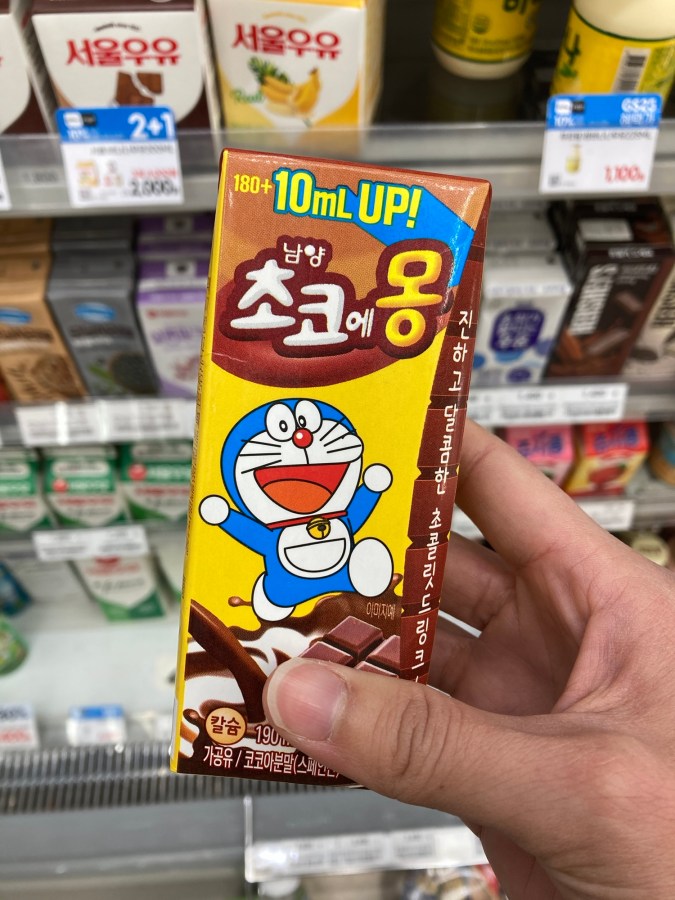 韓國朋友看著我手裡的巧克力牛奶,搖了搖頭,她說,在韓國超商,就屬多啦 a 夢一款最好喝。