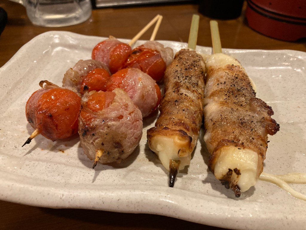 整體來說,這裡的餐點特色就是會用一層薄薄的肉,包覆在食材像是蔬菜、蛋的外面,再抹上一層薄鹽下去燒烤,味道偏鹹,但是配著飲料一起還是相當涮嘴,一口一口停不下來。