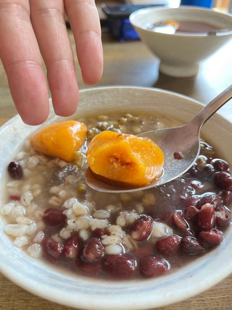 低消限制的關係,我們也是一人點了一碗冰享用,我選綜合口味的,有綠豆、紅豆、薏仁、黃金餃四種配料,最有特色的就是這裡有名的黃金餃:地瓜圓包花生,除了水煮以外,也有油炸的料理方式,可以在熱炒店吃到。