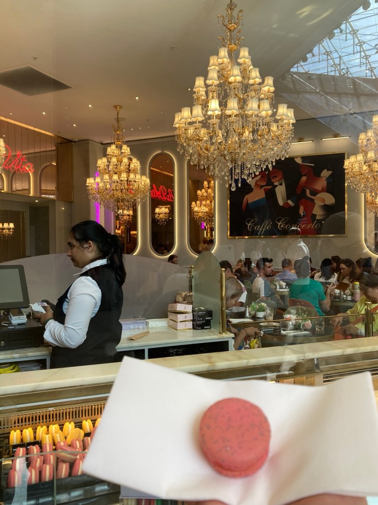 緣起義大利,在法國發揚光大的馬卡龍,我們當然也沒有錯過,可惜時間緊湊的關係,只在羅浮宮下方的 Caffè Concerto 簡單買一顆馬卡龍和其他甜點,以外帶的方式享用。