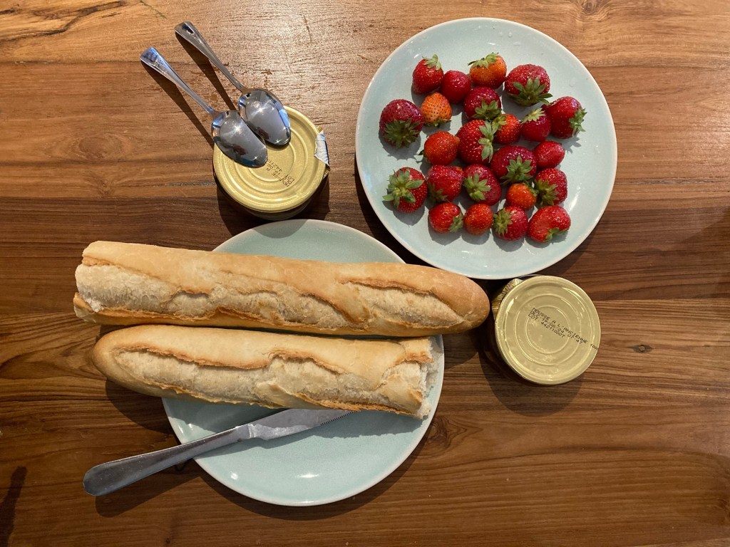 身為亞歷媽的忠實粉絲,看著他兩個混血兒子不論到哪裡都要來一根法國長棍,好奇心作祟下,也在超市買了一條,先原味吃一口,再配上草莓跟巧克力醬淺嚐一下。