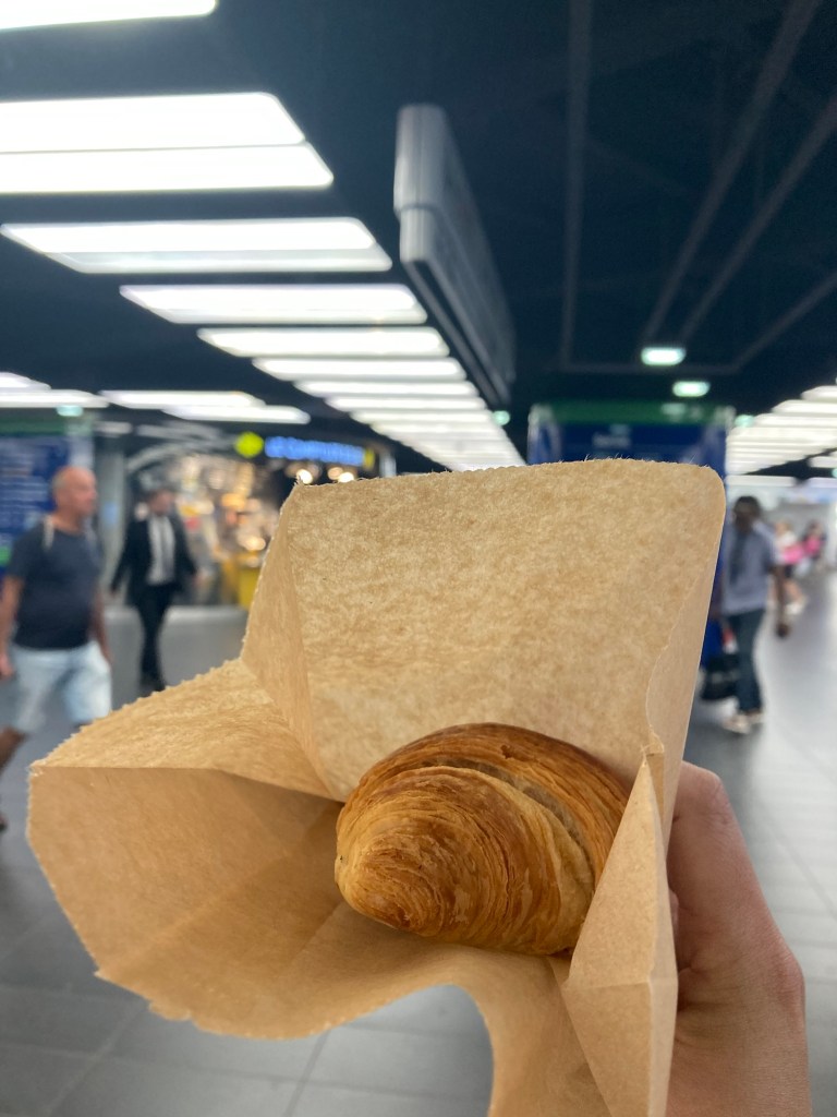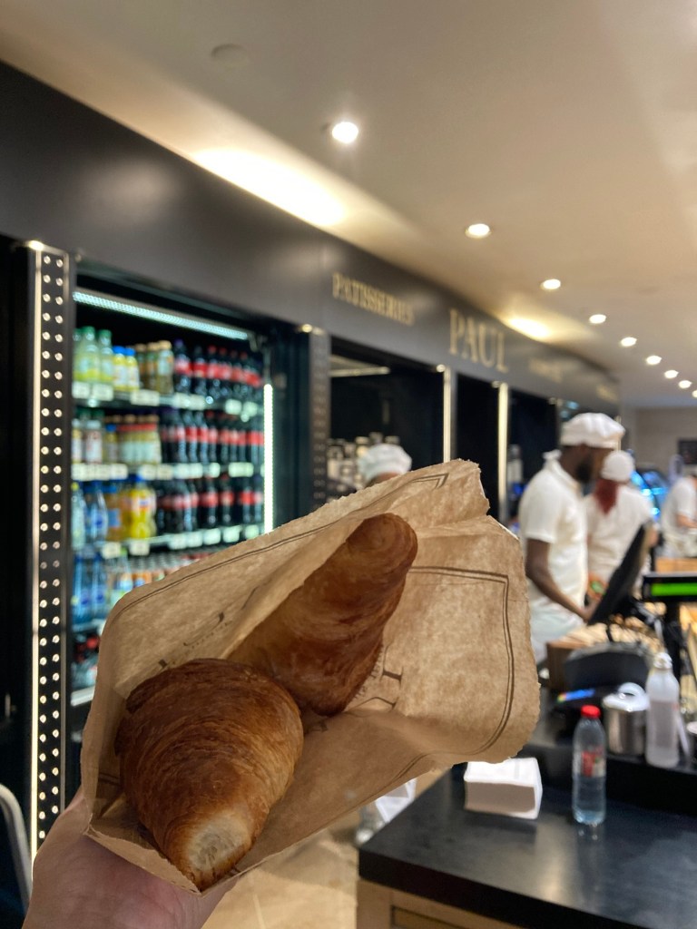 在這趟旅程中,一共吃了三次可頌,一次是台灣到法國的飛機餐,不怎麼好吃,算是一個對照組,另外兩次,分別是在地鐵裡的隨便一家小店,跟法國有名的麵包店 PAUL 品嘗到的。