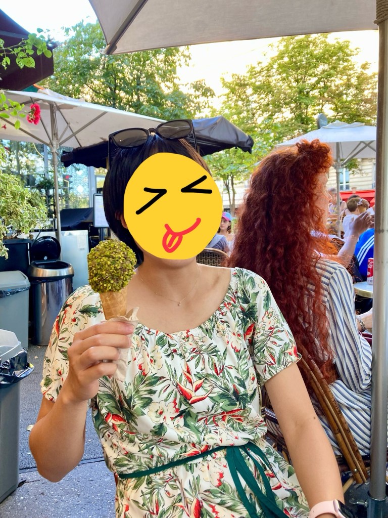 抵達店門口的時候,正逢奧運某項目比賽結束的時刻,難免有一些排隊人潮,室外的用餐區也坐滿了人,所幸店員手腳俐落,翻桌速度也快,大約 10 分鐘的時間,我們就一人一支冰淇淋,找到位置坐下享用了。