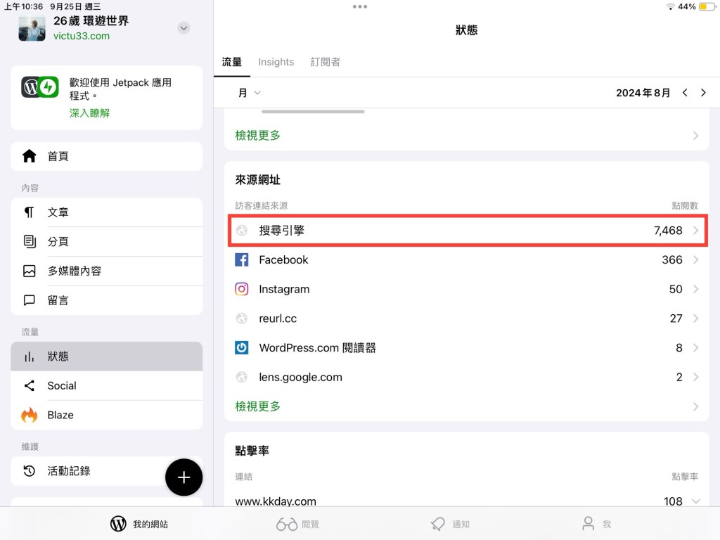 6-8 月的部落格表現,在月流量上都比前三個月更好、更穩定,無論是從平均點閱數(8500+)或者訪客(6700+)來看。此外,部落格的流量來源,也從主要依賴臉書社團分享,吸引觀看群眾,逐漸轉換成自然搜尋的結果。