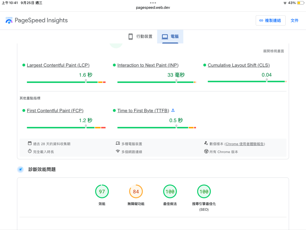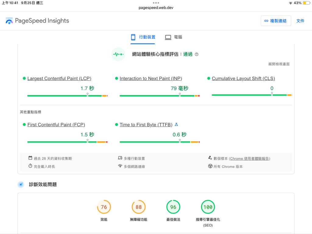 很神奇的是,當我一邊生產文章,一邊煩惱該怎麼優化的時候,使用者體驗就突然通過 PageSpeed Insights 測試,至今百思不得其解。