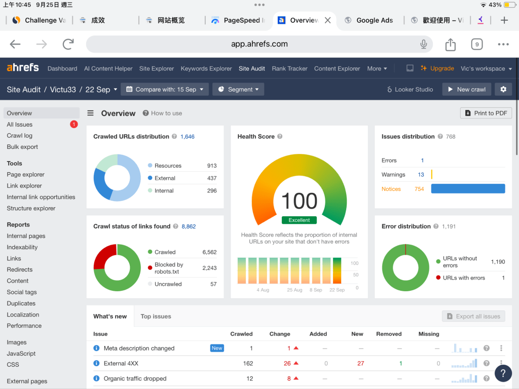 和前三個月比較,victu33.com 在健康度方面沒有什麼太大的變動,透過每個禮拜到 ahrefs 檢視,並根據指示做調整,將分數維持在 95+。