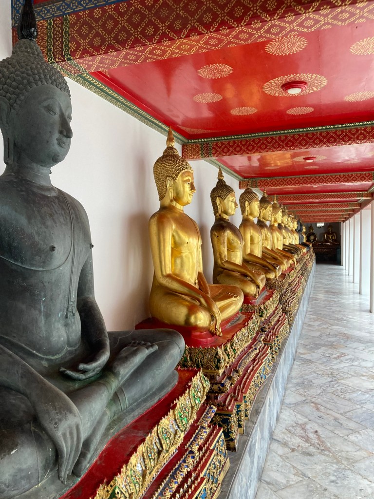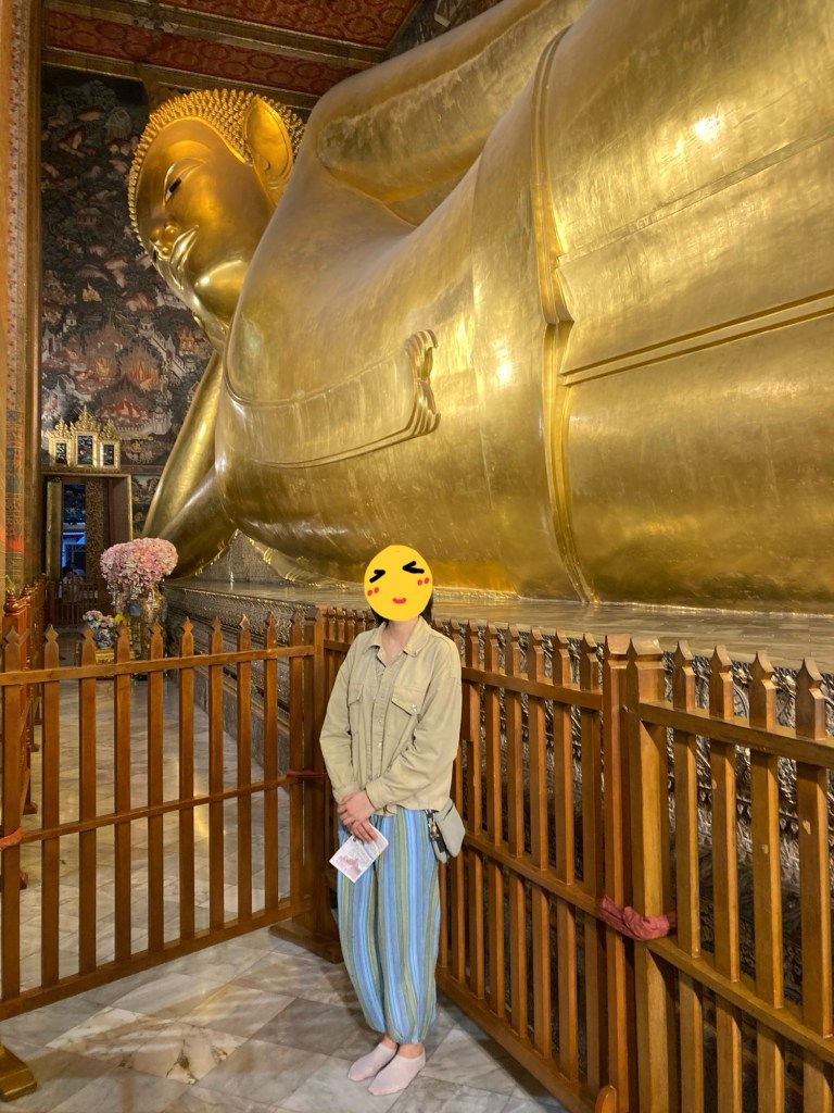 結束大皇宮的參觀後,步行不遠便能抵達著名的臥佛寺。這裡以巨大的臥佛像聞名,長達 46 公尺、覆蓋金箔的佛像展示了佛陀進入涅槃的姿態。