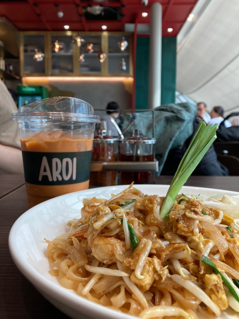 身為曼谷第一大機場,裡頭自然少不了百貨專櫃、餐廳、紀念品店等等。我們在琳瑯滿目的午餐店中,選擇了 AROI 做收尾,因為裡頭有我最喜歡的河粉、泰式奶茶!