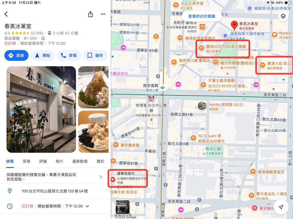 造訪春美冰果室前後,也可以順道前往附近的餐廳用餐,喜歡熱鬧、看表演吃飯,可以到 慶城 HOOTERS 美式餐廳;想要來點日式拉麵,就選擇 雞湯大叔;晚餐時間如果還吃得下,也可以步行 15 分鐘到遼寧街夜市。