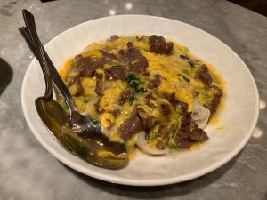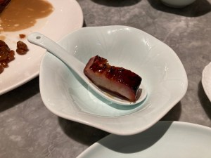 香港相當經典的燒鵝名店,店面豪氣、裝潢華麗、價格昂貴、服務周到,燒鵝皮脆、油香,醬汁濃郁帶點花生味,趁熱吃實屬人間美味。除了燒鵝以外,低消茶類我們選擇鐵觀音,普普通通,沒有特別的印象;另一道主菜烤豬表層微焦、肉質扎實、一咬即斷、厚度剛好,吃起來非常爽;飯麵類的牛肉滑蛋粿條反倒比較沒有特色,表現中規中矩。