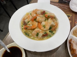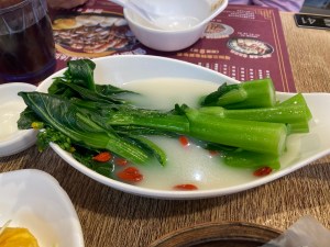 上湯鳳尾蝦很大隻,像是泡過硼酸的巨大蝦仁,一份裡大概有 7-8 隻,不怕你吃,非常過癮;伊麵是我在這趟旅行中印象最深刻的料理,因為一直很喜歡麵食類,但是這種麵:有點像鹽水意麵,入口卻又有一點蓬鬆,這樣神奇的口感是生平第一次吃到,驚喜之餘,也期待下回能再吃上一次。