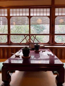 走過嵐山的竹林小徑,一路沿著山路往上,有種遠離現實的錯覺。松籟庵就藏在這片幽靜的綠意裡,窗外是潺潺河水,窗內是傳統日本的和式空間。