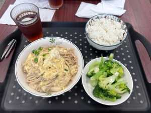 算是比較清爽的菜色,主菜就是豆腐上面放雞肉、雞蛋、金針菇、蔥花,淋上醬汁,另外有兩到三種配菜、白飯。